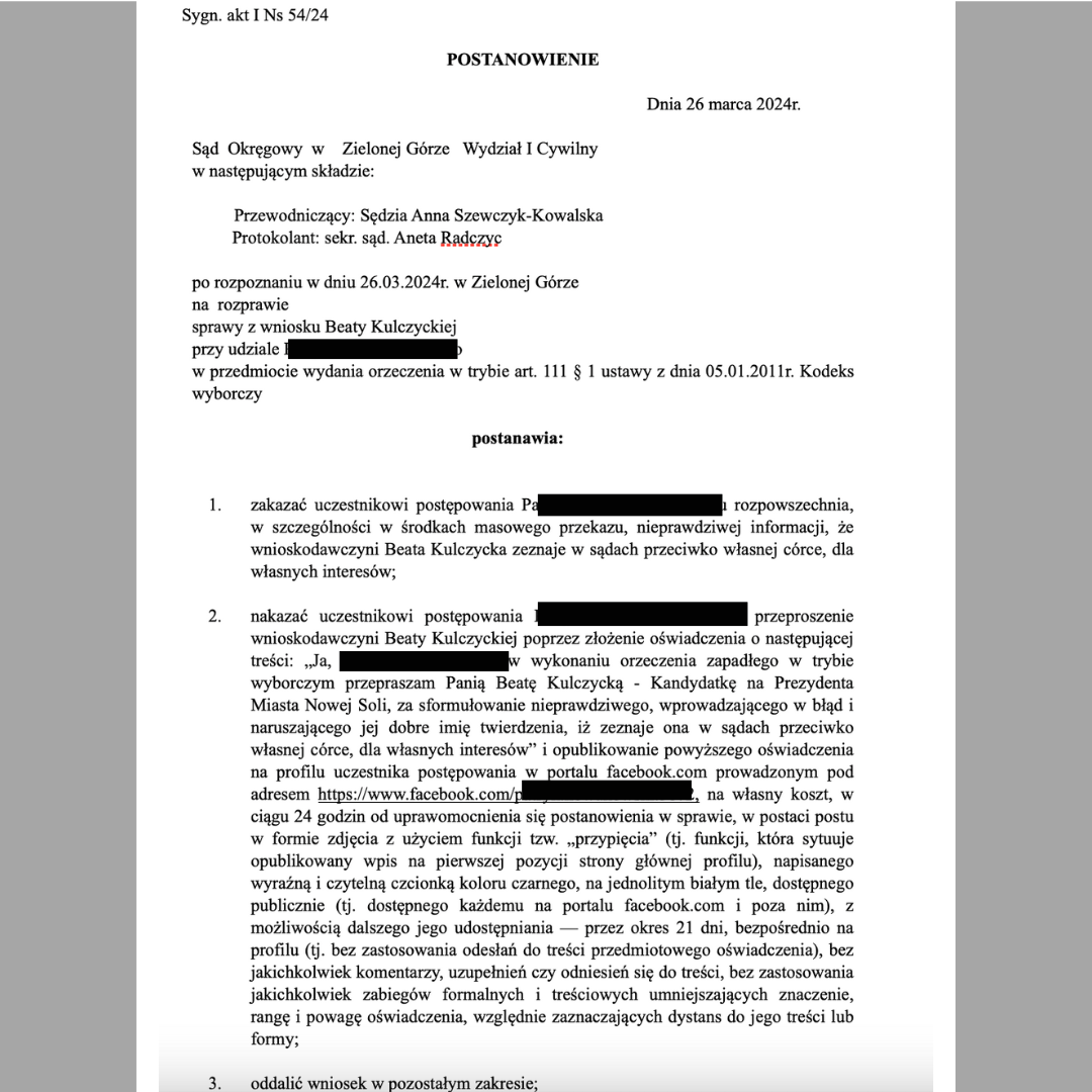 Na skutek wniosku złożonego w trybie wyborczym w imieniu naszej Klientki Pani Beaty Kulczyckiej – kandydatki na prezydenta miasta Nowa Sól startującej z komitetu wyborczego wyborców FNW Wadima Tyszkiewicza i liderce sondaży, Sąd Okręgowy w Zielonej Górze wydał orzeczenie zakazujące uczestnikowi rozpowszechniania nieprawdziwej informacji oraz nakazał mu opublikowanie oświadczenia o wskazanej przez nas treści.